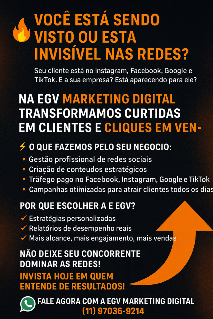 A EGV Marketing Digital leva sua marca para a vitrine que mais cresce no mundo! Transforme visualizações em vendas reais com estratégias de tráfego pago e conteúdo criativo que geram resultados.